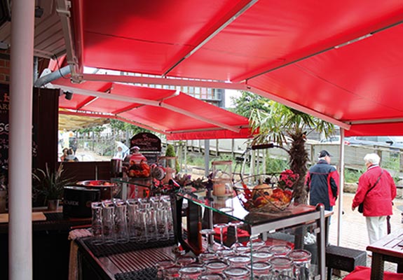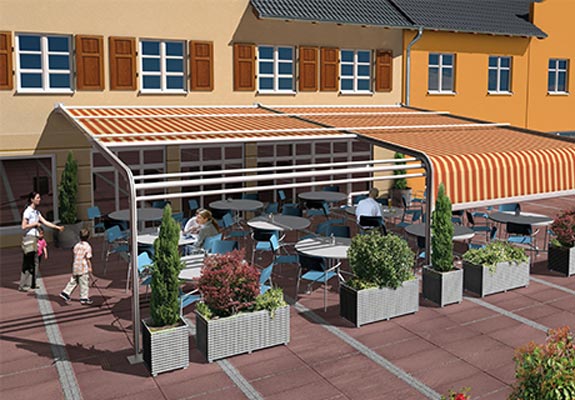 Sie wünschen sich für Ihre Kunden und Gäste nicht nur angenehmen Schatten, sondern auch zusätzlichen Schutz vor tief stehender Sonne, kühlem Wind oder neugierigen Blicken? Die Terrassenmarkise T500 bietet mit ihrem Umlenkbogen einen erweiterten, senkrechten Ausfall und verschafft damit zuverlässig Abhilfe.