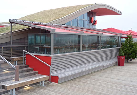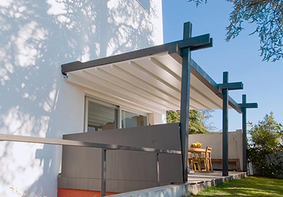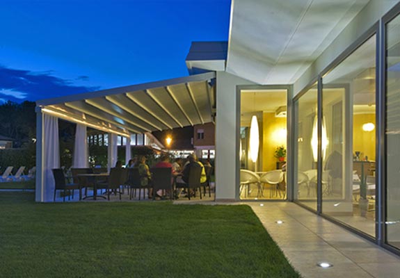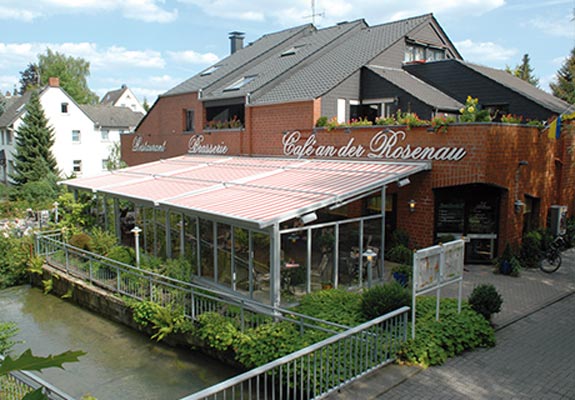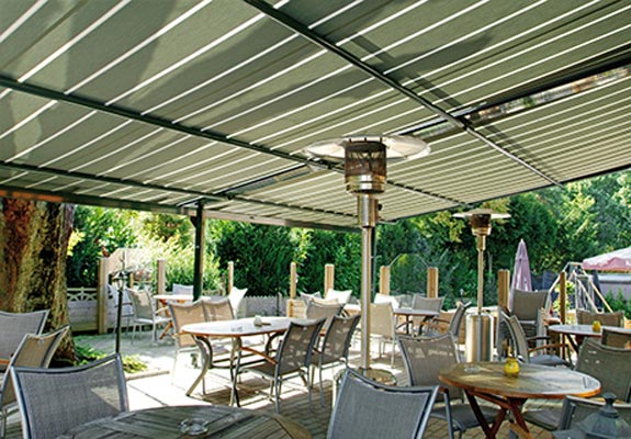 Die PERGOLA SUNRAIN wurde speziell für große Terrassen entwickelt. Ihre Stärke: Sie lässt sich flexibel fast allen Wetterbedingungen anpassen. Diese große Bandbreite in der Anwendung kommt nicht nur der Gastronomie zugute. Auch im privaten Bereich stehen diese Eigenschaften hoch im Kurs. Um die beliebten Terrassenplätze vor Wettereinflüssen zu schützen, sind herkömmliche Sonnenschutzsysteme oft nicht ausreichend. Die PERGOLA SUNRAIN schützt zusätzlich vor Regen und kann auch bei Windstärken genutzt werden, die für herkömmliche Systeme tabu sind. Je nach Größe hält die Konstruktion bis Windstärke 9 (Sturm) stand und kann fast dauerhaft ausgefahren bleiben. Komfortabel lassen sich die Anlagen mit einem Funkmotor steuern. Auf Wunsch kann die Anlage mit einem Schutzdach ausgestattet werden.